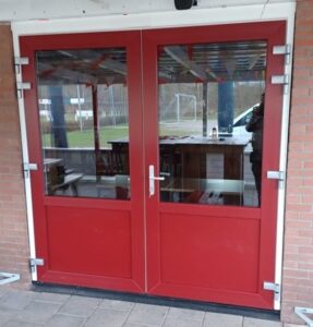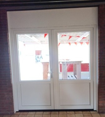 Zoals u misschien al wel gemerkt heeft is Bouwservice Bert Edens uit Heiligerlee druk bezig om in de kantine kunststof kozijnen te plaatsen. Nu waren de nieuwe terrasdeuren aan de beurt.Het resultaat ziet er keurig uit.